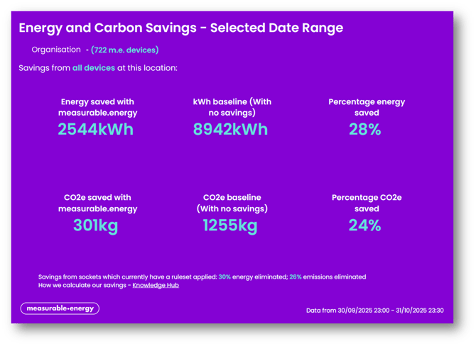 This will provide the energy (kWh), carbon savings (kg) and % reduction for the date range that you select in the Hub.