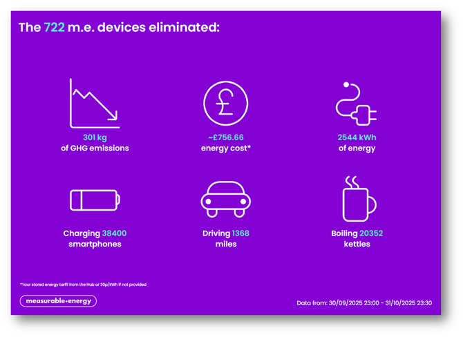 This will provide energy (kWh), energy cost (£), carbon emissions (kg) reductions and their equivalents in terms of number of phones charged, driving in miles and boiling kettles.