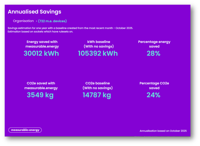 This will provide the energy (kWh), carbon savings (kg) and % reduction annualised from the last full month of data.