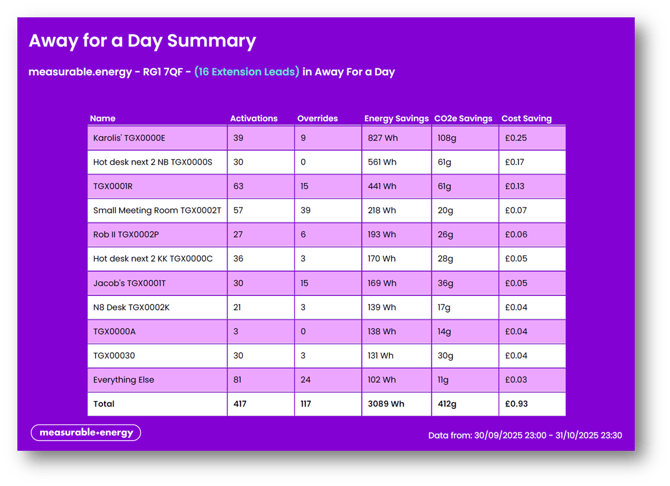 This will summarize the energy savings that have come from using Away for a Day. The report will show the desk extension location, number of times Away for a Day activated, how many times buttons were pressed and all the energy (kWh), energy cost (£) and carbon emissions (kg) savings.