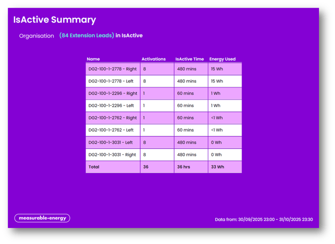 This will summarize when and where IsActive has activated. It will show the location, number of activations and the energy (kWh) used.