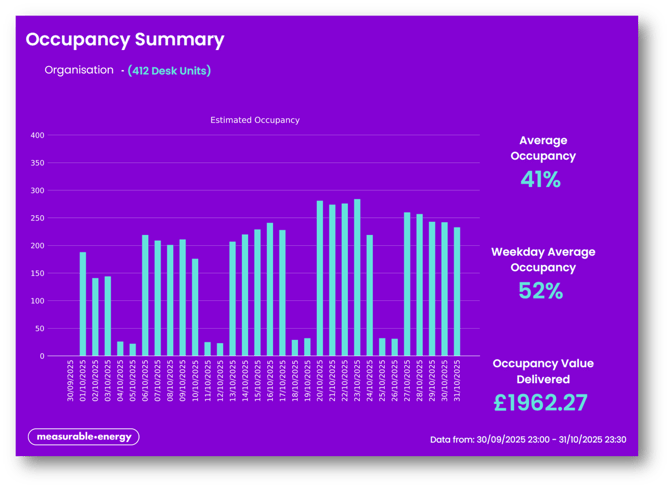 This will summarize the occupancy data visualised on the Hub. It will also provide % weekly and weekday occupancy.