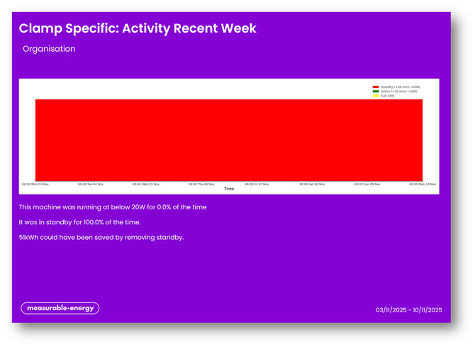 This is a clamp specific report that identify when industrial machinery is wasting energy in standby and therefore also wasting people time on the shop floor.