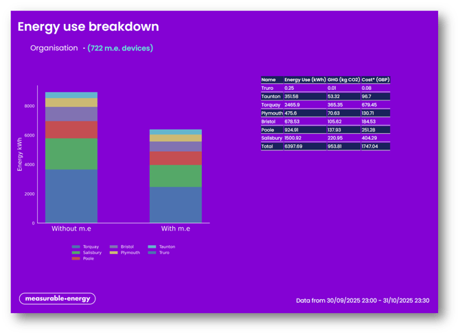 This will provide the energy (kWh) use breakdown from the different locations underneath the level you have run the report from. It will also show the before and after energy from using the measurable.energy Platform.