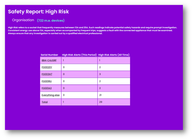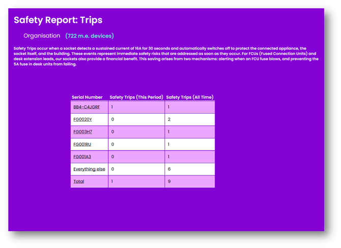 This will provide two separate report pages. One that shows the sockets that have tripped and one that shows sockets that have shown above normal energy use. Full details on Trips and High Risk can be found here.