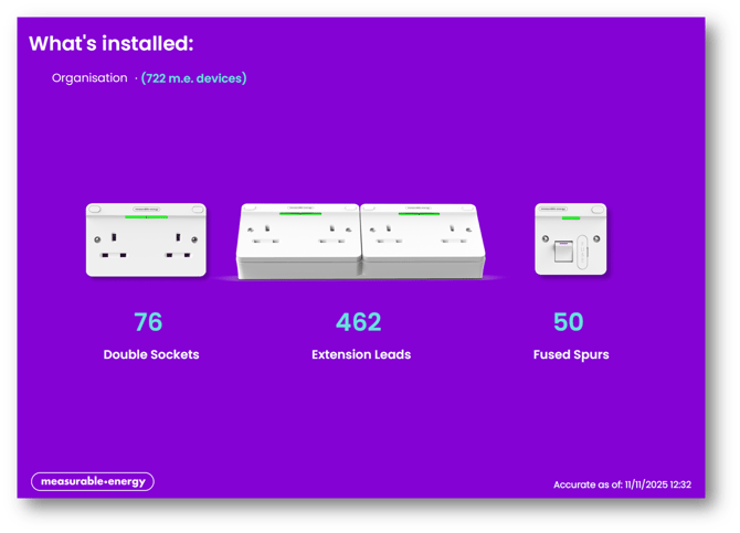 This page provides the split between the different measurable.energy plug sockets that have been installed: Double Sockets, Extension Leads and Fused Spurs.